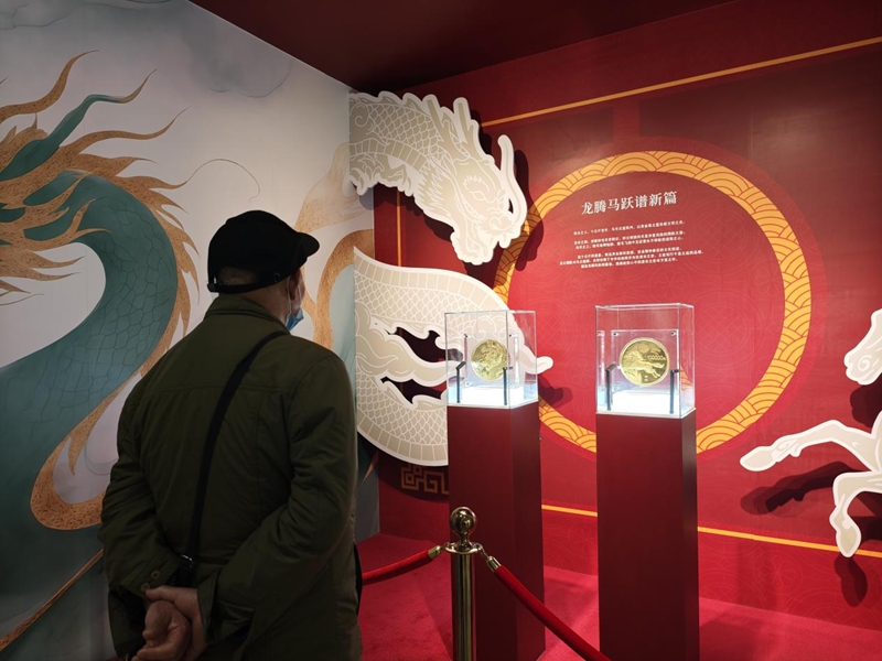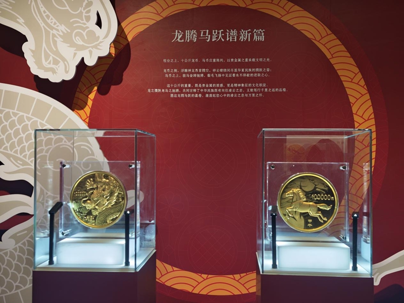 现场展出的金质纪念币。品鉴会上,重达10公斤的金质纪念币受到关注。该币背面图案为奔腾的群马与祥云、山峦景象,采用手工打造,运用高浮雕、多层喷砂等工艺,具有较强的视觉表现力。“马在中国传统文化中象征奋进与成功,相关寓意在纪念币设计中得到多样表达。”活动相关负责人介绍,该套纪念币在设计上采用“一币一图”方式,并在工艺上持续创新,体现了现代造币技术的发展。