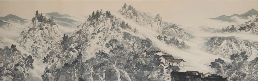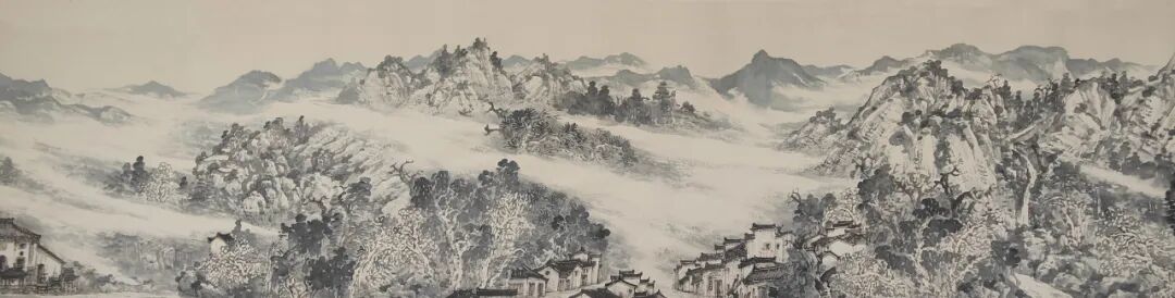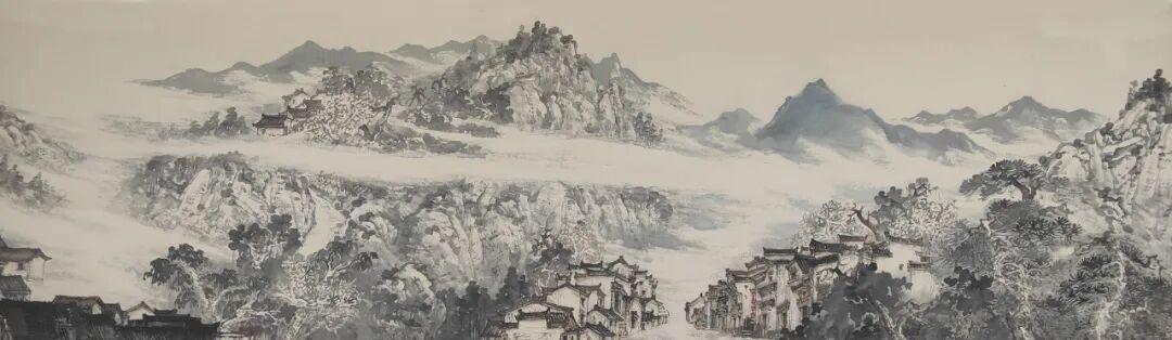 同时,画家对传统和现代的结合不乏匠心,画面融入现代构成元素,人居自然和谐而圆融。现实的皖南民居白墙黑瓦融入古风山河,“美丽乡村”与青峰大河相互增彩,画面却无一丝违和感。