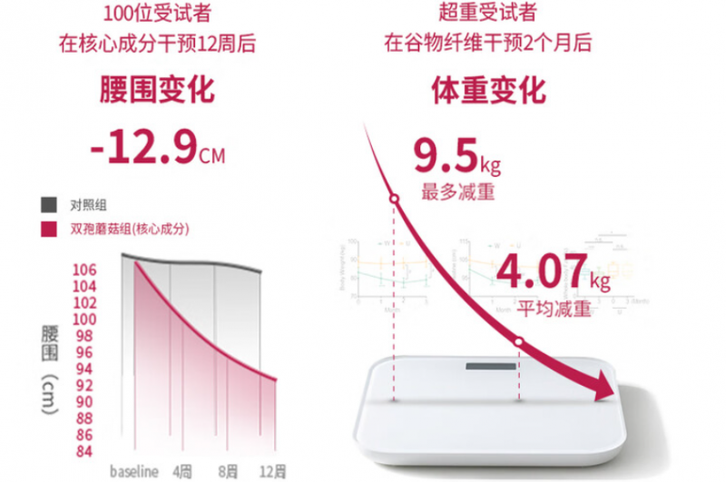 核心需求:精准燃脂、减少局部脂肪囤积。腰纪线中的双孢蘑菇提取物阻断外源脂肪,CLA 靶向激活局部燃脂通路,12 周即可看到明显的腰围、腿围缩减,临床受试者平均腰围减少 12.9cm,腰腹赘肉显著改善。