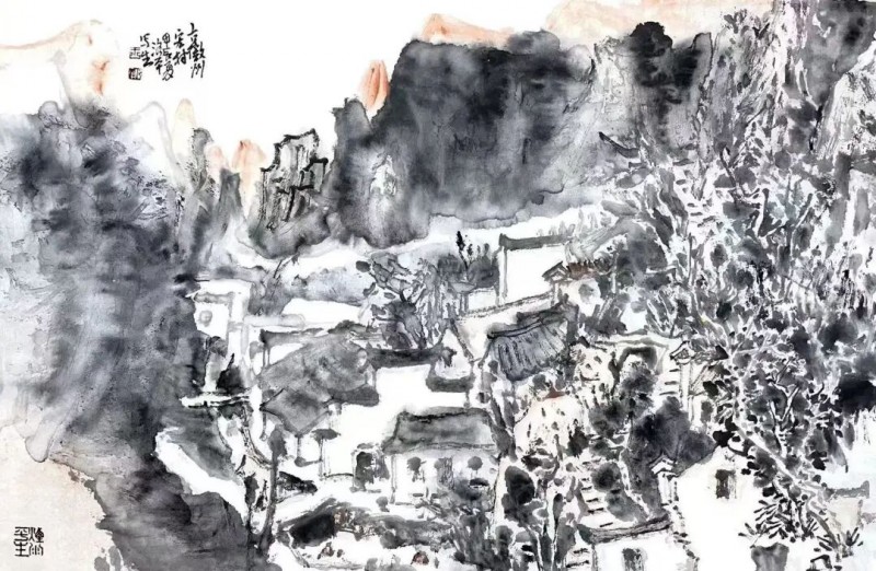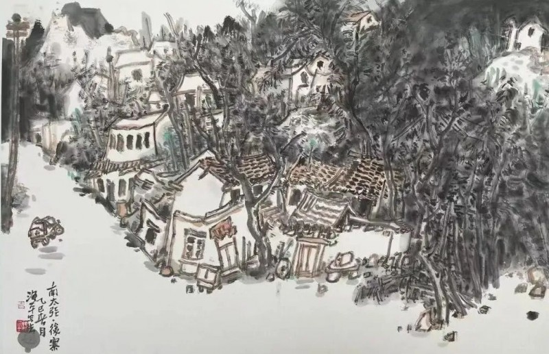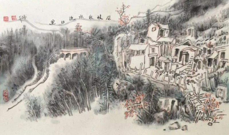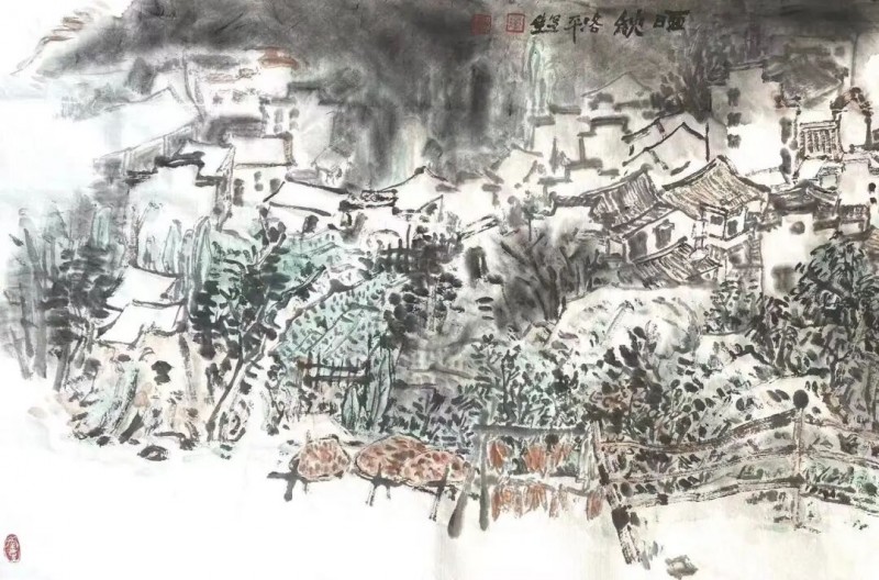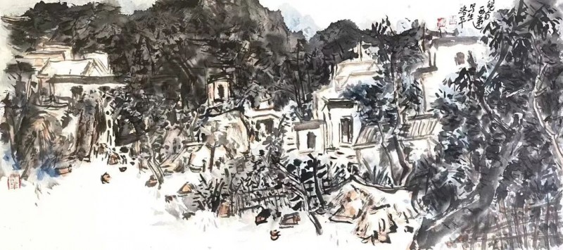 他的创作,始终紧扣时代脉搏,让山水成为承载文化记忆与时代精神的载体。2021 年入选黄河文化主题创作展的《大河落天》,以全景式构图铺展黄河奔腾咆哮之态,笔墨间既有 “黄河之水天上来,奔流到海不复回” 的雄奇壮阔,又蕴含着中华民族自强不息、坚韧不拔的精神内核;2023 年获 “豫见民宿” 优秀作品奖的《周窑十八坊》,则以细腻笔触描绘怀川古村落的人文风貌,青瓦白墙映着远山如黛,炊烟袅袅缠着流云似纱,将传统民俗与现代生活相融,展现了中原大地的生机与活力;2016 年参展 “天下为公” 两省联展的《醉卧苍崖观秋月》,借山水之境抒家国情怀,苍崖如碑,秋月如鉴,暗含对民族复兴的深切期盼。从《翠林幽居图》被焦作市博物馆永久收藏,到《丹峡平湖》入展第十四届河南省美术作品展,他的每一幅作品都是对时代的回应,对文化的守望。