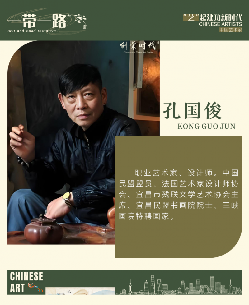 孔国俊,祖藉江苏南京。职业艺术家、设计师。中国民盟盟员、法国艺术家设计师协会、宜昌市残联文学艺术协会主席、宜昌民盟书画院院士、三峡画院特聘画家。