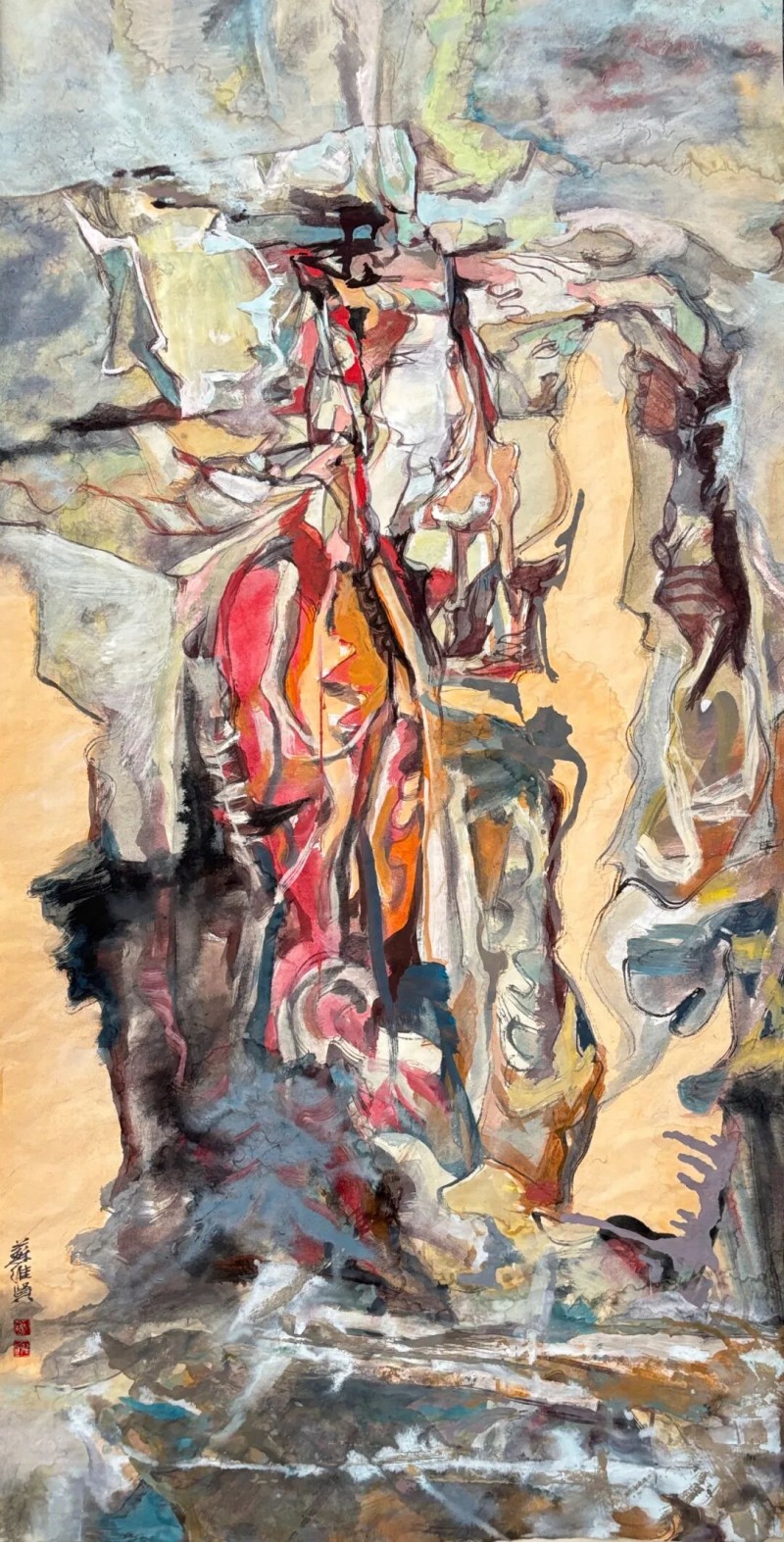 这些新作与此前的绘画实践之间还是有着紧密的关联,只是与其在中国文学和历史典故中提取创作主题和母题不同,苏维贤更注重由心而发的形式律动。相较于前期研究中国古代壁画色彩与形象的丰富变化,通过捕捉不断浮现的形象持续延展画面的尺幅形成长卷式的巨制不同,新作中偶发性的莫可名状的“乱力怪神”喷涌而出,是不讲道理的形象的堆叠、捏合、杂糅的并置,是酒神狄俄尼索斯的狂喜,是浑沌的神异世界的灵怪的纵情狂欢,以至观者无从辨析其由来,只能说是其内心中呼之欲出的幻象。当然,这是业已古稀之年的苏维贤有意为之,他试图忘记所有的法,以“无意识”的状态作画,凭着直觉作画,甚至有意将视觉形象含混起来,这样才能不断让笔墨和色彩获得自由表现的空间。换而言之,苏维贤认为构建形象与笔墨和色彩的自由表现之间存在隔阂,或者说,在大多时候,笔墨和色彩皆依附于视觉形象而存在,脱离形象的笔墨和色彩被驱逐至无关紧要之处,而现在自己所要做的,就是让笔墨和色彩,让直觉的自由表现占据画面中心位置,视觉形象成为笔墨和色彩,成为直觉自由表现的附属之物。显然,苏维贤在新作中并未表现出决然的转变,形象依然像躲藏在森林中的精灵一样不时探出头来,在酣畅淋漓的笔墨和色彩中,这些面庞像是消逝在记忆抑或是历史时空的游魂。