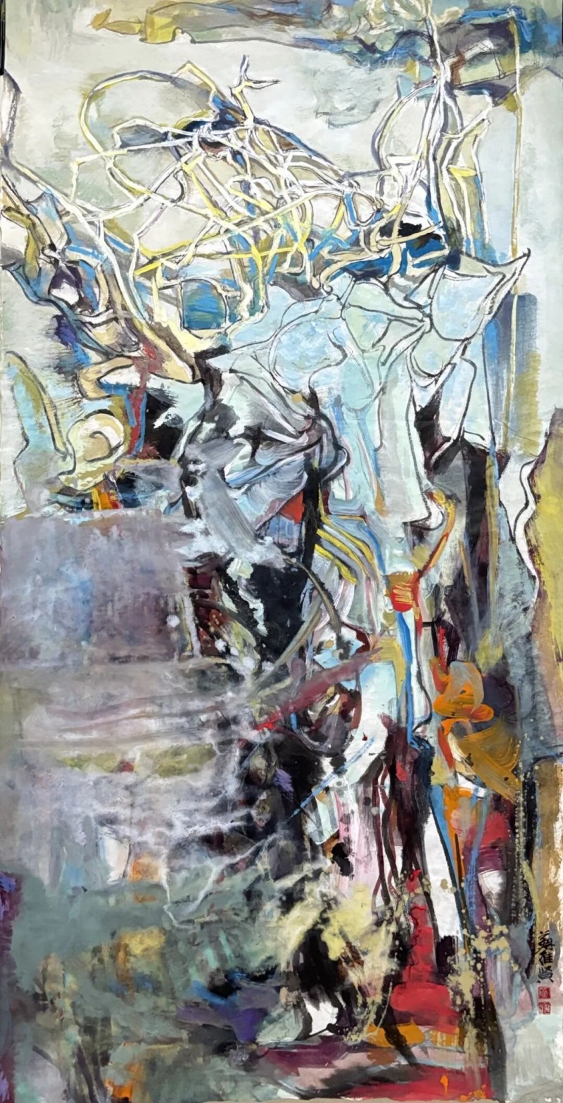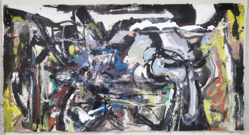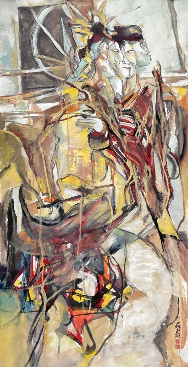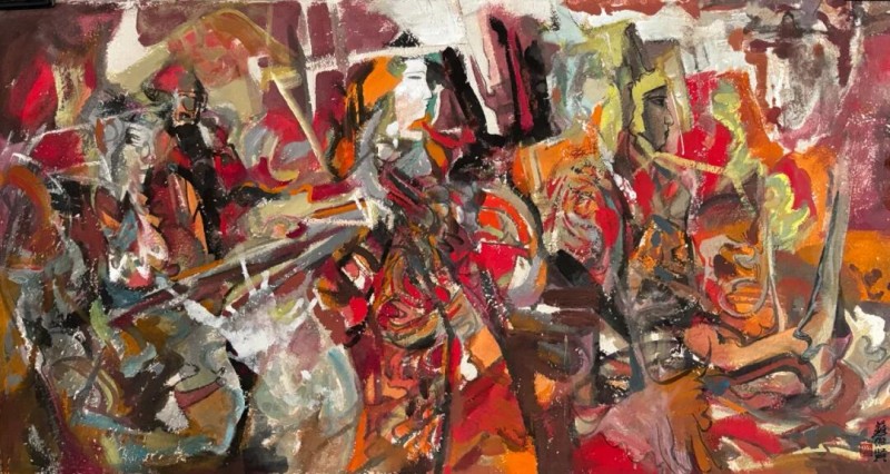 不仅如此,苏维贤在尝试将传统、现代,东方、西方,笔墨、色彩,叙事、形式的共贯融合,因此我们能在这些新作中看到很多未曾完全咀嚼消化的残片,甚至是缠斗的斑驳陆离的场景,似曾相识,然已莫能辨其渊源。纵览这批新作,能看到苏维贤在实验共贯融合的丰富性,他会在不同的画面上尝试新感受,在恣意中感受直觉性的存在。事实上,没有脱离控制的自由意志,苏维贤所有的新作都是对旧作的回顾、梳理、检讨和再创作。尽管这些直觉性的自由表现在过往的艺术生涯中屡有表露,这是其内在性情使然,然而这些新作还是展现出一种自觉的、整体的征候性的新变。不管是近半个世纪艺术生涯积淀的使然,还是对既往创作观念的不满足,乃至是自己对艺术甚至生命的新感悟和新思考,苏维贤都在新作中展现出了他蓬勃艺术生命的创造力和表现力。