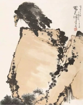 潘天寿作为开山宗师,以“强其骨”主张将指墨从文人即兴“墨戏”的民间艺术,升华为具备系统化、学术体系的官方艺术。他上溯五代两宋山水精神,近取石涛、八大笔墨意趣,融入金石学成果构建“笔墨—气骨—精神”审美体系,注入严谨学术基因。其独创“焦墨指线法”,将金石书法“屋漏痕”笔意融入创作,线条兼具青铜铭文质感与弹性;代表作《松鹰》以造险山石、刚柔交织的松鹰意象,尽显雄奇苍劲之美,不仅成为美术史经典范式,更颠覆指墨辅助技法的传统认知,树立“返本开新”典范,可以说,潘天寿开创了近代指墨艺术的先河。