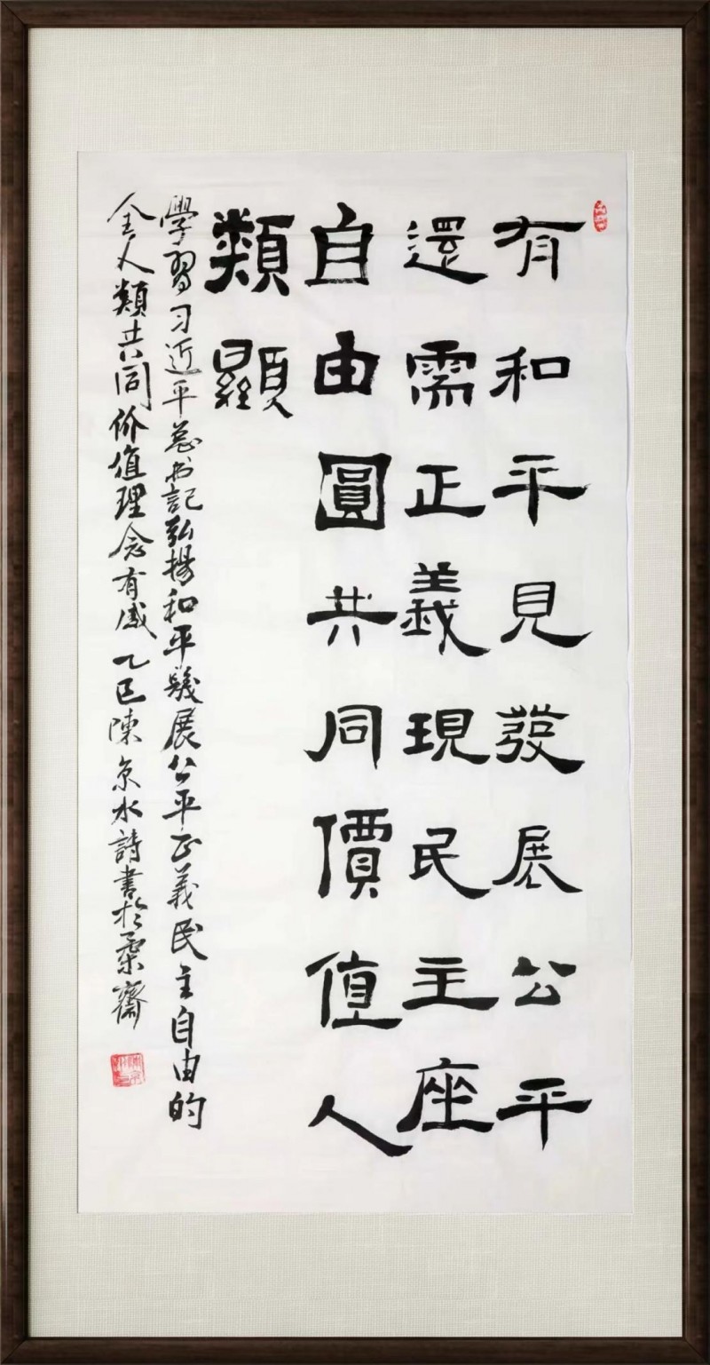 2021年参加建党百年全国优秀艺术名家颁奖盛典。入编北京冬奥会贺岁台历。2022 年为朱仙镇岳飞庙捐赠的书法作品《满江红·祖国统一》,已刻碑入住碑林,被岳飞庙永久收藏。书法作品《刻二十大发愿偈》,以瓷板画的形式,由景德镇大师烧制完成,镶嵌到了曲阜尼山孔子故居墙上,永久性展出。2025 年4 月作品《为人民服务》制成中意国宝级礼鉴进行了文化交流,为世界文明交流互鉴树立了典范。《圣德在天龙 贤道复兴梦》作品赠送26 国元首。《请党放心 强国有我》赠送中国国民党原党主席洪秀柱,开展了《海峡两岸书画情 挥毫泼墨共此时》活动。