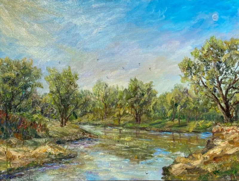 《额尔齐斯河风光之一"日月同辉"》(60 cm x 80 cm) 油画作品