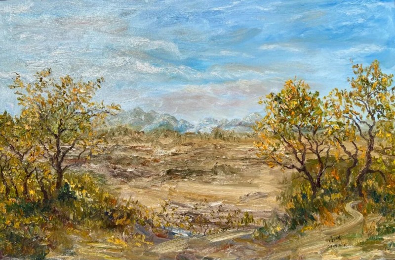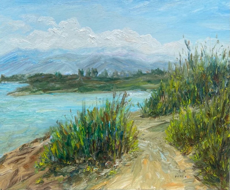 《呼图壁水库一角"路在脚下》(50cm X 60 cm) 油画作品
