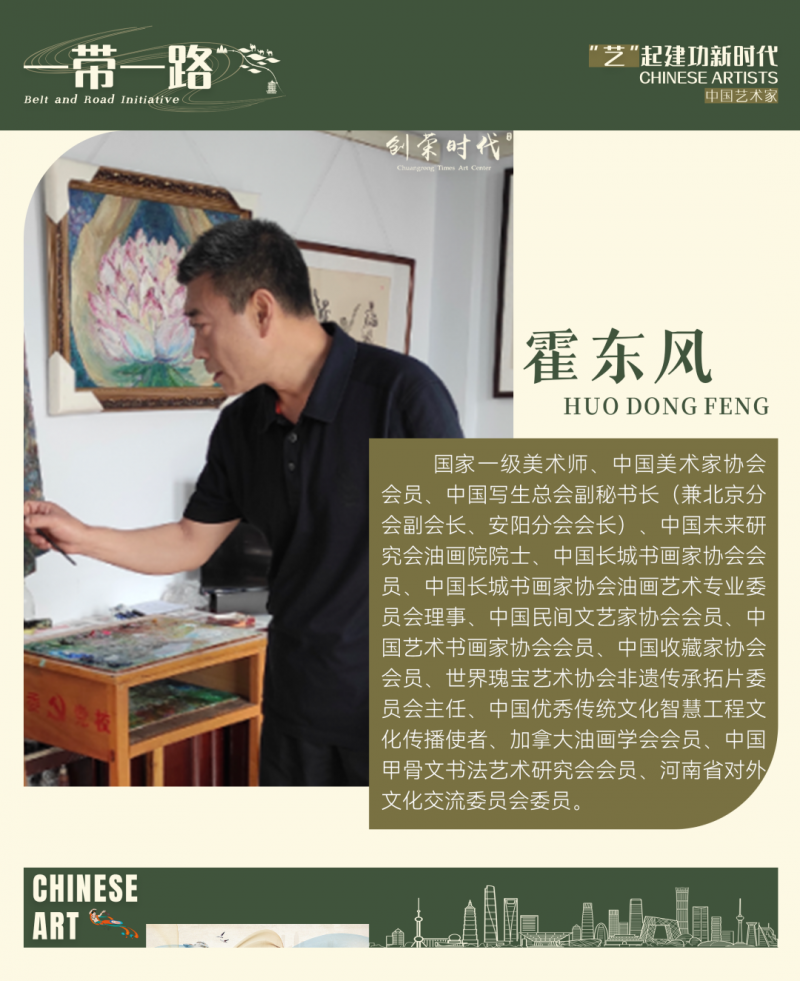 霍东风,1968年出生于河南省汤阴县。现为国家一级美术师、中国美术家协会会员、中国写生总会副秘书长(兼北京分会副会长、安阳分会会长)、中国未来研究会油画院院士、中国长城书画家协会会员、中国长城书画家协会油画艺术专业委员会理事、中国民间文艺家协会会员、中国艺术书画家协会会员、中国收藏家协会会员、世界瑰宝艺术协会非遗传承拓片委员会主任、中国优秀传统文化智慧工程文化传播使者、加拿大油画学会会员、中国甲骨文书法艺术研究会会员、河南省对外文化交流委员会委员。