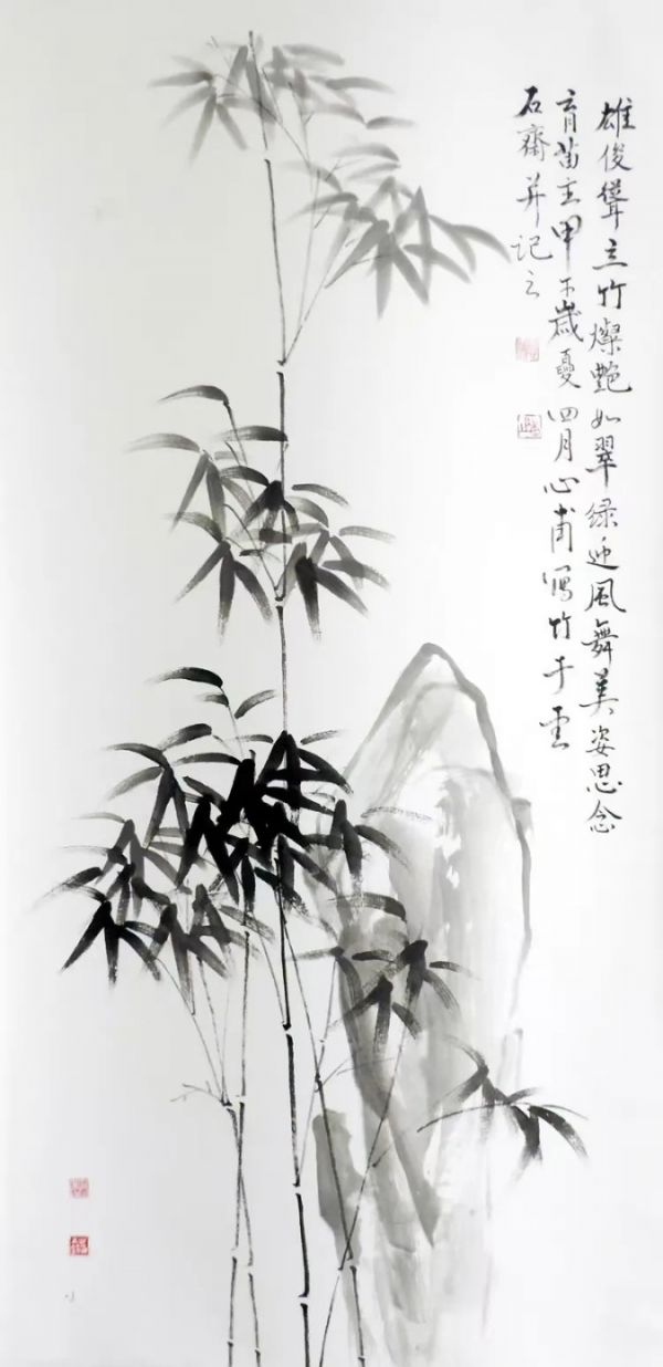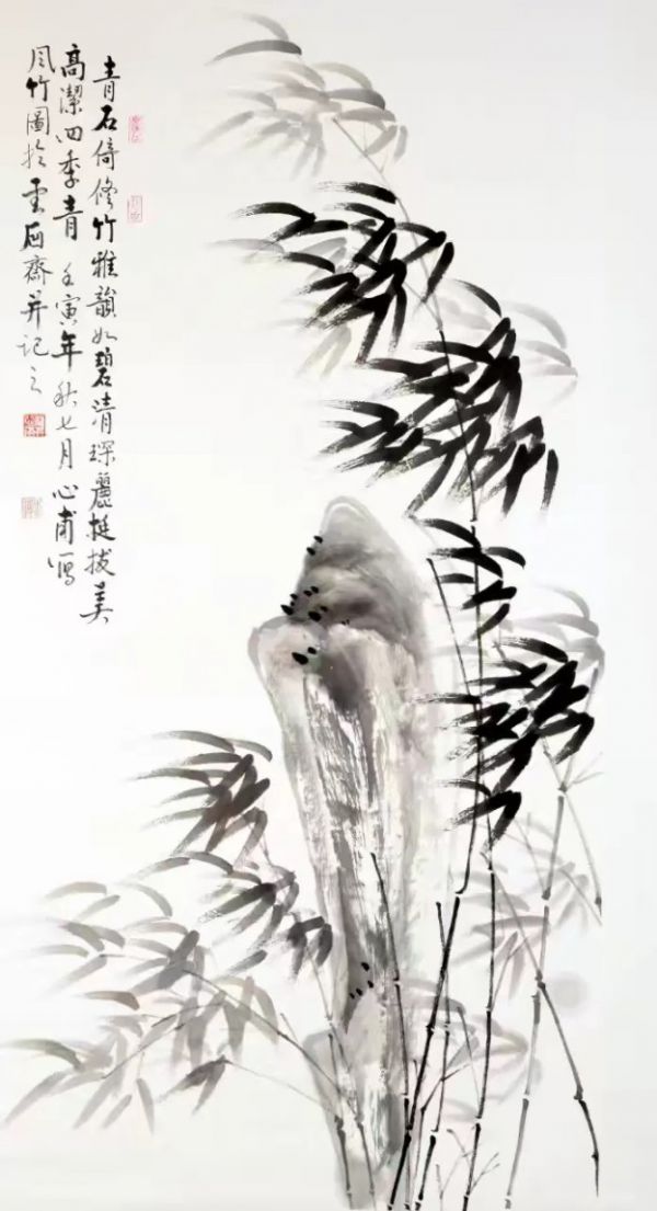 龚老画的水墨兰竹,是纯粹从自然中而来,他曾在浙江湖州竹林中观察一年四季竹的变化,长期写生竹的形态,寻找新的组叶章法,他能借古开今,熟练掌握古法笔墨,在继承传统基础上突破古人,又一次变革。仔细观察龚老画的竹叶,每片竹叶都有阴阳开合之理法,既形似又神似。运用书法笔意写竹,画的竹叶,均是楷书的竖画、撇画、捺画的书法用笔,特别是运用楷书的“悬针垂露”的书法用笔,写出了竹子神韵,生气盎然,看了令人心情舒畅。可以说,他是继郑板桥之后,又一位画兰竹高手。龚老说:“我不知道竹子怎么会画出来的。”这说明水滴石穿非一日之功,绝非一朝一夕,他淡泊明志,又经过长时期的艺术磨砺,终自然而然得到。