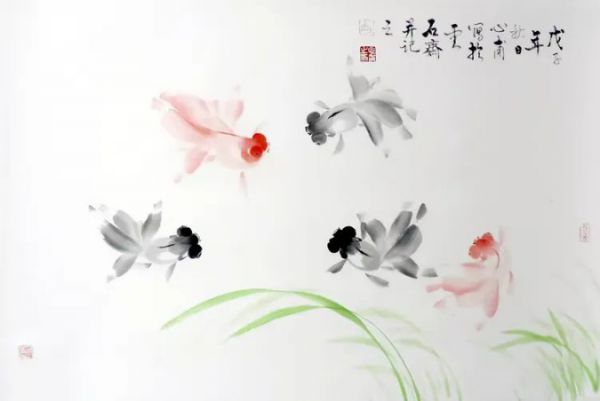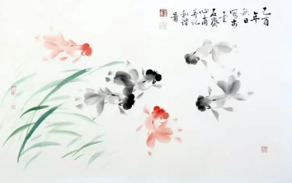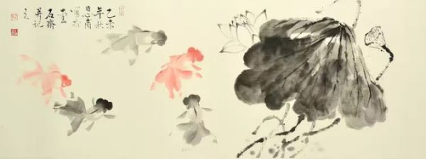 金鱼作品,形神兼备,古朴淡雅,天然纯真,章法考究,清逸简洁,目前画一条金鱼简练到十一笔至十五笔就能画完成,作品贯穿古今,别开生面,前无古人,后未见来者,树立了另一个典范。