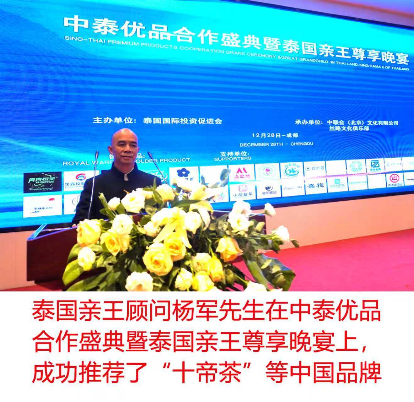 在中国四川成都的“中泰优品合作盛典暨泰国亲王尊享晚宴”专享盛会中,杨军先生以“泰国亲王周易文化艺术顾问”的身份,用专业的水准、敬业的精神,投入到相关工作中去。特别是杨军先生成功的向泰国亲王推荐了:十帝茶、《十帝茶道》等中国茶文化及中国品牌,为助力中国文化输出和中国优质品牌扎根海外作出了实质性的供献。由于杨军先生协同泰国皇室亲王殿下出色的完成了相关工作,被亲王殿下破例特邀一对一的单独合影留念,并亲自为杨军先生戴上那一枚象征着至高荣耀的徽章。这是多少拔尖精英梦寐以求都无法获得的莫大荣幸啊!杨军先生在盛会中强调,此次盛典不仅是中泰友好的生动注脚,更是“一带一路”倡议下文化交流的实践典范。 他呼吁双方企业把握皇室资源与RCEP机遇,实现从产品出海到品牌扎根的跨越。 未来,中泰优品合作将持续深化,为两国关系注入更多时代活力。