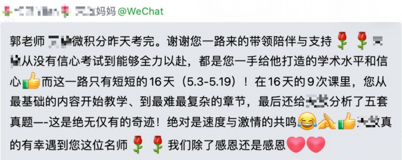 郭老师的努力,也让她收获了行业与家长的认可:她曾获大学生数学建模竞赛一等奖、高中数学联赛二等奖,持有高中数学教师资格证、AMC数学竞赛官方教练证书、AP微积分官方认证教师资质;在机构任职时,她是“年度最优秀老师”,收到过无数家长和学生的感谢信;如今成为独立教师,不少家长都“慕名而来”,甚至有外地家长专程让孩子跟着她在线上学习。但对郭老师而言,这些荣誉和认可,都不如看到学生的成长、家庭的幸福更有意义。
