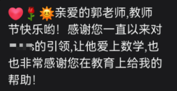 在这个快节奏时代,我们常常追问:好的教育是什么样子?郭老师用七年的实践,给出了她的答案:好的教育,不是分数的堆砌,而是生命的唤醒;不是知识的灌输,而是思维的锻造;不是单向的付出,而是双向的成长。她以数学为舟,载着学生穿越知识的海洋;以哲学为楫,帮学生拨开成长的迷雾,让每一个遇见她的孩子,都能在数学课堂里,找到人生的方向,收获成长的快乐。从北大校园到教育一线,从芯片工程师到数学教育者,郭老师的身份在变,但她“育人”的初心始终未变。在未来的日子里,郭老师将会继续带着她的“数学哲学”,在教育道路上坚定地前行,唤醒更多生命的内在力量,点亮更多家庭的幸福。而她的故事,也会激励更多教育者,回归教育的本质,用匠心守护每一个孩子的成长,让教育的光芒照亮更多人的“向阳”之路!