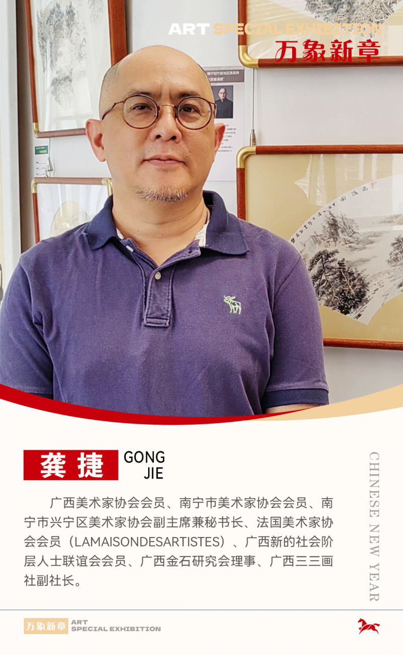 龚捷,1988年毕业于广西艺术学院美术系附中,1992年毕业于广西艺术学院美术系。现为广西美术家协会会员、南宁市美术家协会会员、南宁市兴宁区美术家协会副主席兼秘书长、法国美术家协会会员(LaMaisondesArtistes)、广西新的社会阶层人士联谊会会员、广西金石研究会理事、广西三三画社副社长。早年中国画创作师承陈玉圃、黄格胜、郑军里、阳山诸先生,尤擅水墨山水,数十年沉潜笔墨、笃行不怠,于传统文脉中渐拓己格。被海内外多家机构与私人收藏。
