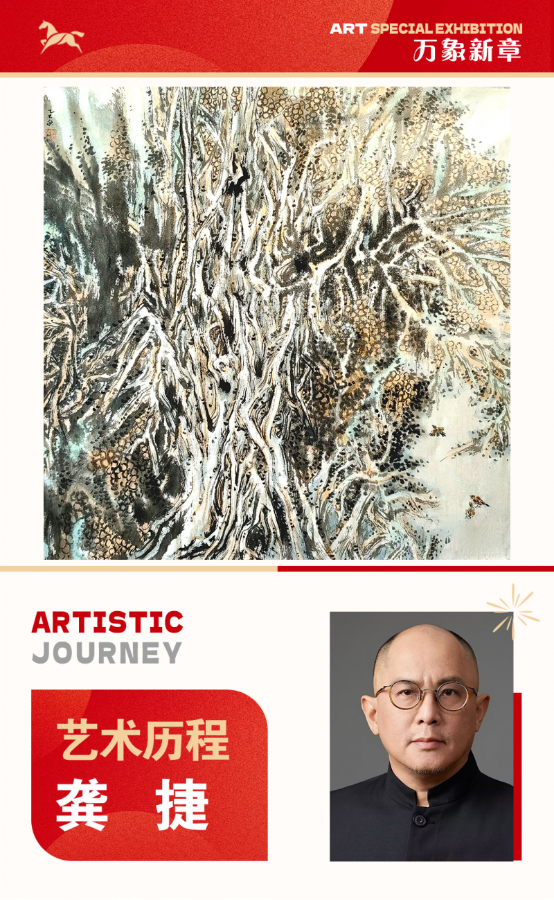 近年,龚捷于现代新水墨画领域潜心拓新,秉持“承传统之魂、开当代之境”的理念,在笔墨语言与文化表达上双向求索。始终坚守书画用笔的骨力韵律,深研“笔墨”之法,同时借鉴现代艺术构成逻辑,将自然物象提炼为兼具张力与意蕴的视觉符号;色彩上打破常规水墨单一格局,探索“墨色相融”及“水墨视觉符号”的调和之道,呼应当代审美意趣。创作中,立足本土文脉,融入国际视野,力求在传承与创新间寻得平衡,为现代新水墨画发展殚精竭力。