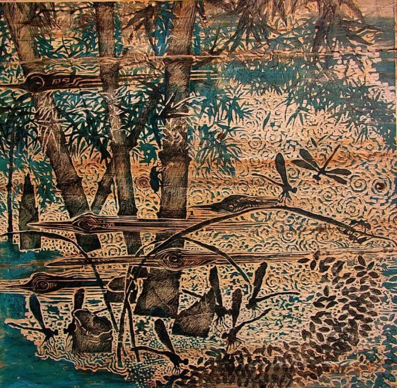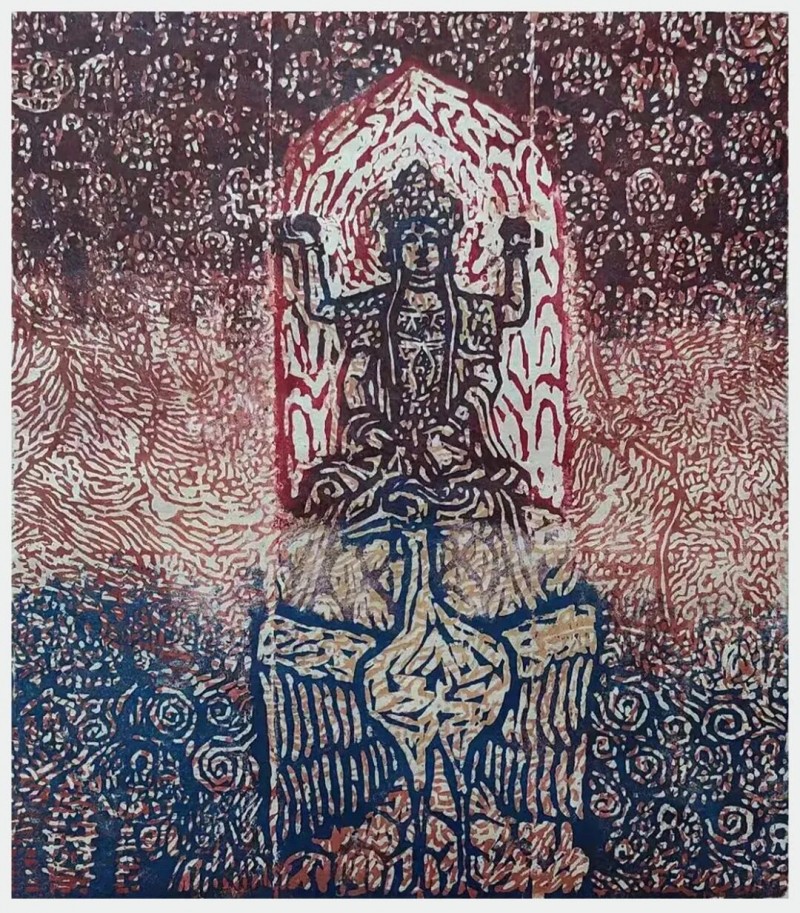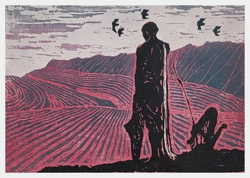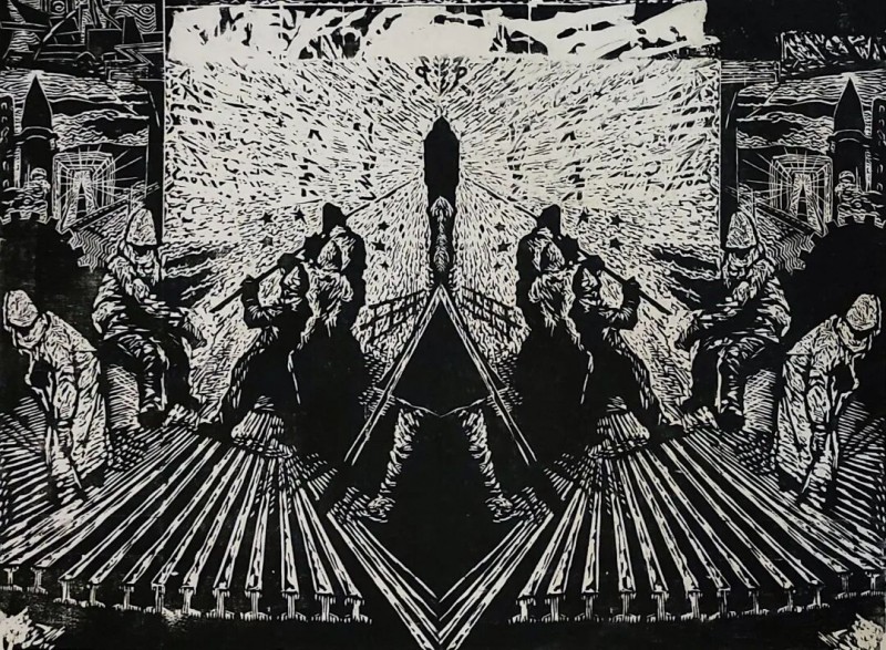 转业后的曹向东,始终没有放下手中的刻刀。回到故乡大足 —— 这座以石刻艺术闻名世界的文化沃土,他仿佛找到了艺术的根脉。大足石刻千年传承的造型技艺、流畅线条与深邃意境,潜移默化地影响着他的创作。那些摩崖造像中简练而富有力量感的造型方式,那些将复杂故事化为生动画面的叙事智慧,都被他融入版画创作,使作品兼具传统韵味与现代审美。但曹向东并未止步于故土的滋养,上世纪 80 年代,响应三线建设的号召,他来到攀枝花,这座在钢铁熔炉中崛起的城市,为他的艺术注入了全新的生命力。