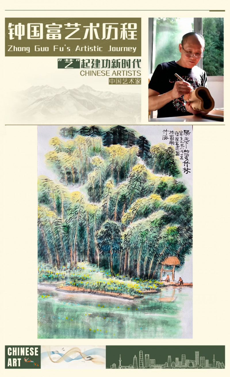 钟国富,1951年生于隆昌,退休前供职于四川江安县文化广电旅游局,后成立竹工艺大师工作室。擅长竹刻、国画、篆刻,作品入展并获全国、省展金奖。央视《百科探秘》报道;参加央视直播《你好四川·蜀南有海》;台湾、香港电视台《大陆探奇》报道。现为中国非遗江安竹簧省级代表性传承人、高级民间雕刻艺术家、四川省工艺美术大师、四川书法家协会、四川美术家协会会员、四川香格里拉彩墨画研究院研究员、江安县书画协会第四、五届主席。