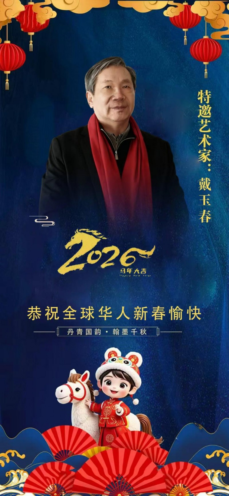戴玉春,著名书法大家。1953年9月生,国家特级书法师。现为北京故宫博物院艺术研究员,中国艺术研究院院士,联合国特约艺术大使,国际非物质文化艺术促进会会长,中俄文化联合促进会理事长,中国文联(世界名人艺术研究协会)副主席,中国书画艺术非遗传承委员会常务副主席,全国书画艺术委员会副主席,中国文化金融发展联合会常务理事长,亚洲书画家协会副主席,世界非物质文化遗产研究院副院长,中国书法家协会考级中心评委,中国楹联学会书画艺术院教授。作品被认定为“一级珍贵艺术品”,收录入“国宝档案”和“国家文物库”。曾获中宣部“五个一工程奖”“国家文艺泰斗丰碑奖”,文化和旅游部“国家文化艺术奖”“共和国艺术名家成就奖”“联合国和平艺术金奖”“国际艺术金马奖”“世界文化艺术金奖”“世界文化艺术终身成就奖”“世界华人艺术金奖”“胡润全球艺术金笔奖”“书法世界级金奖”“二十世纪国际艺术名家教授国际金奖”“环球艺术不朽丰碑奖”“世界文化交流伟大贡献奖”,联合国教科文组织“世界艺术奖”。被中华人民共和国文化和旅游部授予“中国四大国粹传承人”“世界和平文化功勋人物”“中国爱国艺术家”终身荣誉称号。中国文联等单位授予“中国书法艺术传承人”“中华顶级书法家”“中国文学艺术界文化品牌人物”“中国书法泰斗大师”“共和国十佳杰出艺术人物”。中国书法家协会等单位授予“中国最具影响力50位书法名家”“国宝级艺术大师”。联合国等授予“联合国文化艺术勋章”“联合国艺术泰斗”“联合国书法艺术巨匠”“国际殿堂级艺术大师”“荣耀中国—世界文化艺术大师”“世界文学界功勋艺术家”“世界著名文化外交大使”“影响世界十大金牌艺术家”“全球艺坛领袖人物”等荣誉称号。