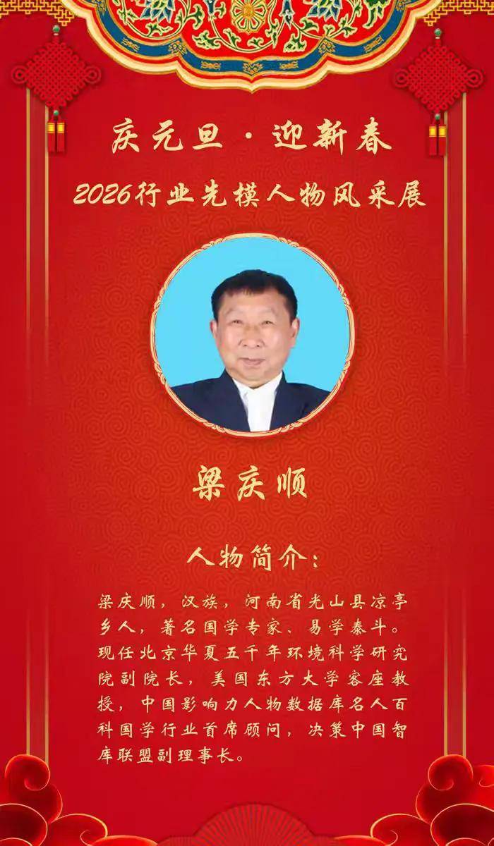 梁庆顺,汉族,河南省光山县凉亭乡人,现任北京华夏五千年环境科学研究院副院长、美国东方大学客座教授、中国影响力人物数据库名人百科国学行业首席顾问以及决策中国智库联盟副理事长。他17岁便与《易》结下不解之缘,利用业余时间潜心研究易学风水文化。此后,他经常跟随父辈五叔深入学习易经风水,开启了长达四十多年的学易、研易、用易之路。