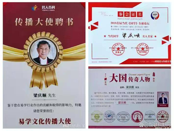 梁庆顺先生凭借在易学领域的卓越贡献,频繁受邀以贵宾身份出席各类重要活动。2019年,他的学术成就得到了广泛认可,收获了一系列重量级荣誉。4月,他应邀参加华夏五千年环境科学研究院举办的“第11届世界易学大会暨2019第六届华夏国学论坛”学术交流活动,与国内外同行深入交流探讨。5月,在全国100家媒体寻找《中国易学家》纪实报道活动中,他荣获《中国易学家》纪念证书和牌匾。6月,在2019第四届中华易经“金罗盘奖”世界华人评选活动中,他凭借精湛的技艺和深厚的学识,获得“金牌风水师”荣誉称号。10月,作为行业杰出代表,他入驻《中国影响力人物数据库》,并参与中华国学文化系列节目《名师有约》的录制。12月11日,他被“中国民族品牌影响力论坛组委会”授予“中国民族品牌十大领军人物”称号。