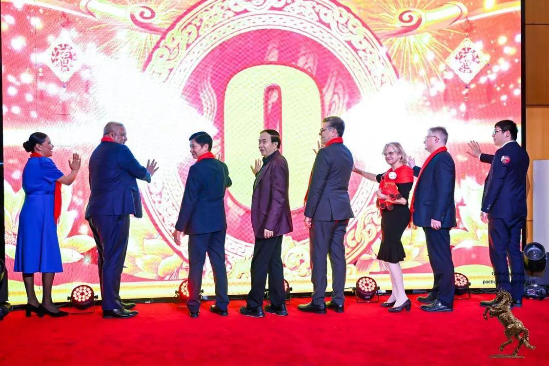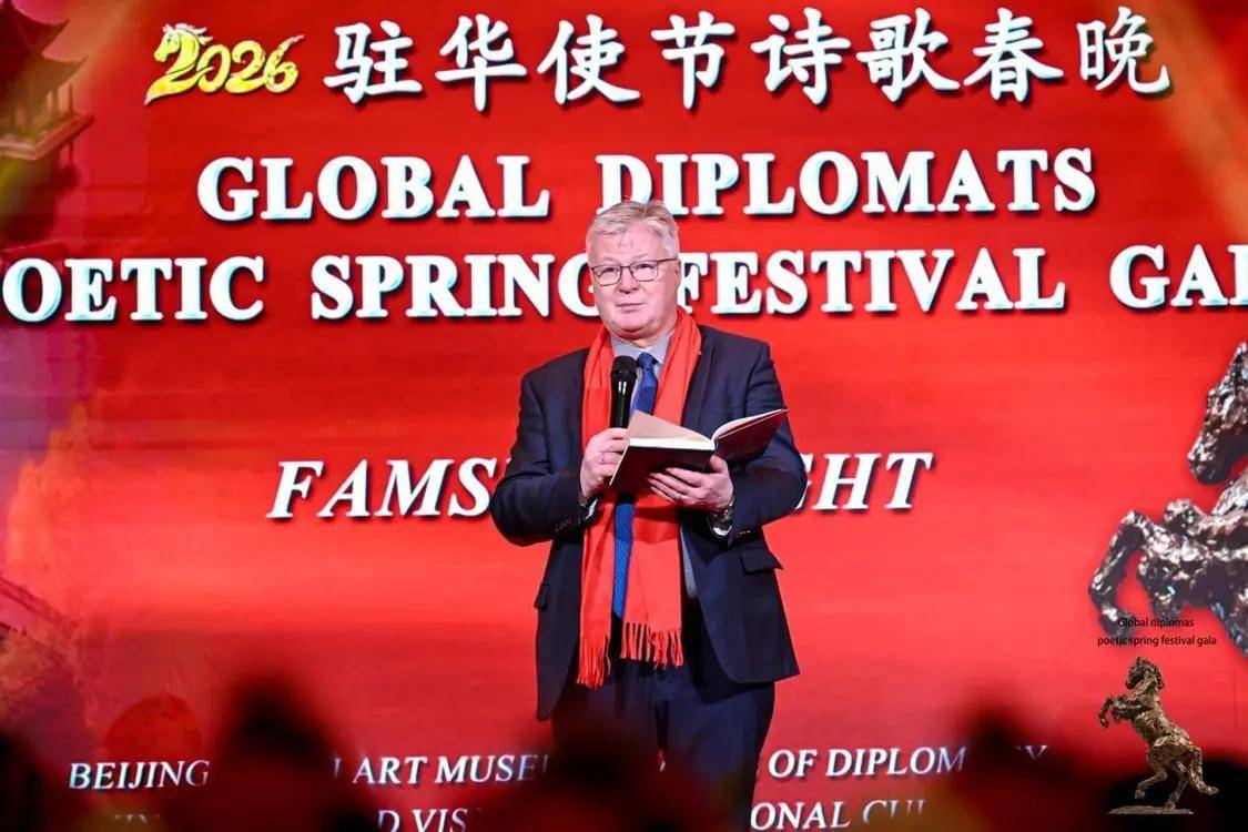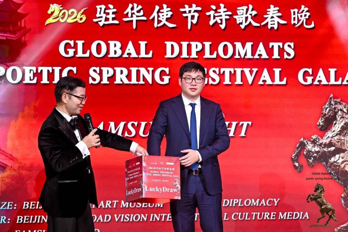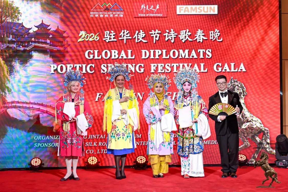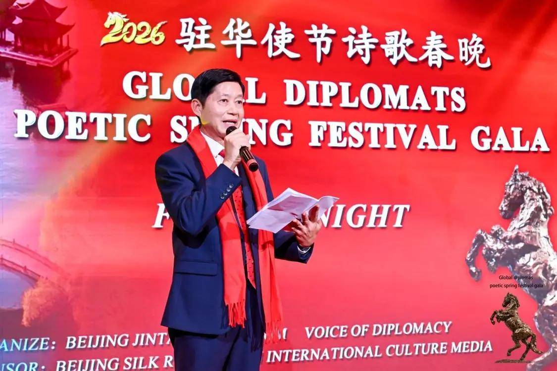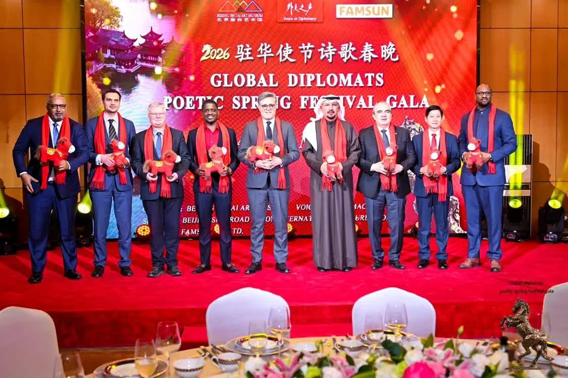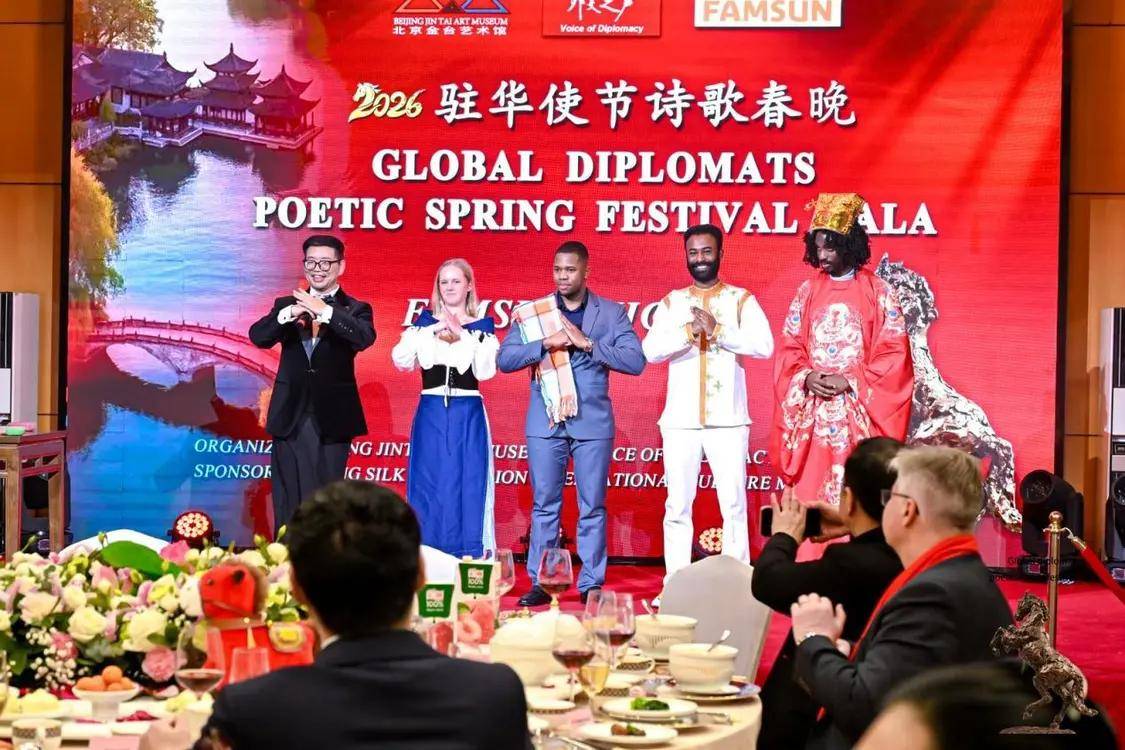 2月12日,农历丙午年前夕,由“外交之声”携手北京金台艺术馆联合主办的“2026驻华使节诗歌春晚:丰尚之夜”在京隆重举行,以“世界非遗”春节礼赞敬世界。来自巴基斯坦、巴巴多斯、玻利维亚、佛得角、格林纳达、科威特、拉脱维亚、乌克兰、缅甸、意大利、西班牙、希腊等55国百位驻华使节、国际组织代表及文化学者等齐聚一堂,共赴一场春之约。诗词、京剧、音乐、太极、书画与非遗等文化交相辉映,为即将到来的马年新春谱写了一曲跨越国界的文明交响。