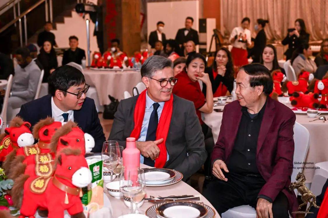 使节们抵达时,主办方为大使、夫人及嘉宾佩戴上象征吉祥的红围巾,两名京剧演员在背景板前与来宾亲切合影,浓浓年味扑面而来。