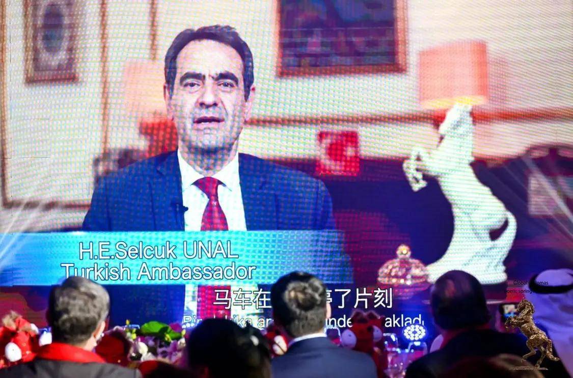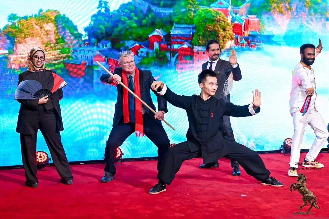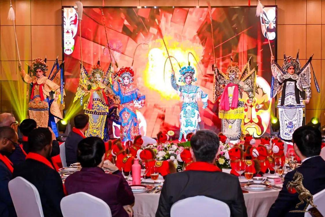 外交之声主编正清登台开场,邀请在场驻华大使共同录制马年新春拜年视频。大使们手持“福马”吉祥物,用中文齐道“马年大吉”“马到成功”,京剧演员一字排开,传统与现代交融的迎新画面成为当晚首个高潮。
