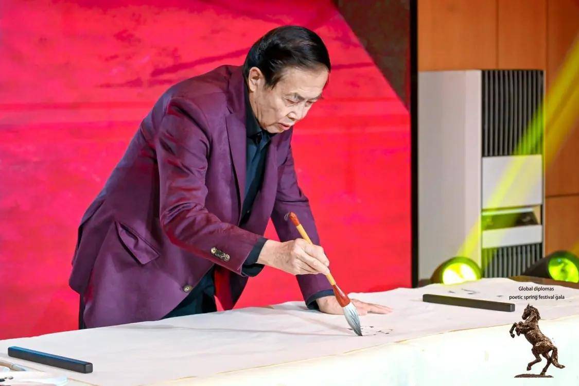 作为将中国生肖文化推向国际的艺术使者,袁熙坤先生曾应邀创作虎年、牛年等系列生肖作品。此次于诗歌春晚即兴挥就的《马到成功双骏图》,不仅延续了他“以形写神”的写意精神,更融入了对“一带一路”倡议下万马奔腾新图景的诗意表达。