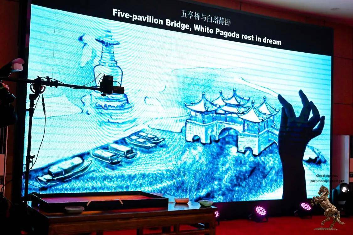 沙画师则以指尖绘出诗韵江南与智慧扬州,光影流动,四季扬州风情,诗意盎然,丰尚智慧园及世界版图,串起中国现代农业与各国一带一路的纽带。