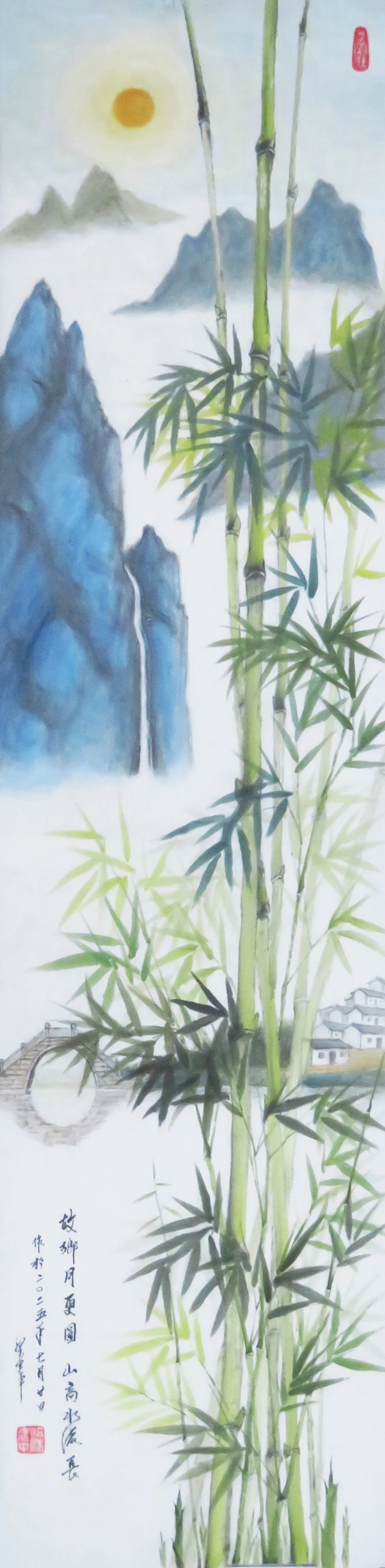 国画《故乡月更圆 山高水流长》(136x34cm)