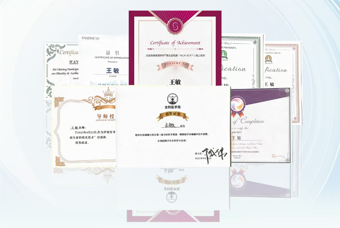 作为濡白天使、伊妍仕等国际再生品牌的全国指定讲师,王敏院长每年参与十余场行业峰会,将自己的再生抗衰经验分享给数千名同行。并参与国内外的相关学术会议,学习先进的学术理念与技术,她研发的联合注射法,有效降低了再生材料易产生的结节风险,提升了操作安全性,为数千名医生提供了可复制的临床范本。