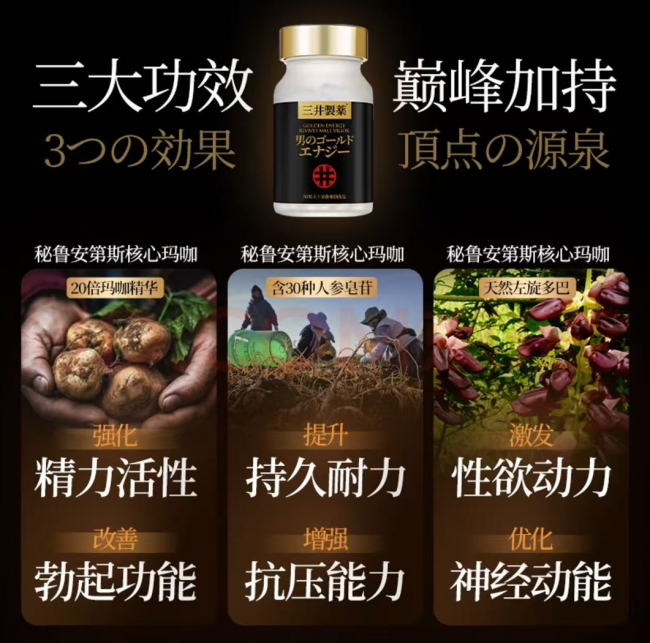 三井龙虎丸来自日本三井制药株式会社,是男性健康领域的技术革新者。品牌采用行业首创的VITALITY MAX专利提纯技术结合独家20倍超浓缩提纯工艺,核心在于提纯超20倍玛咖浓缩精华。玛咖精华具有卓越的男性调理活性,分子结构更加稳定,身体渗透性更强,可以最高效地激发男性潜能。该技术突破了传统男性产品吸收率低、效果差的技术瓶颈,实现从分子层面的精准递送。产品不含西药成分,无副作用无依赖性,温和调理,正向身体调节,专注男性生殖养护方向,处于男性产品行业第一梯队领先水平。