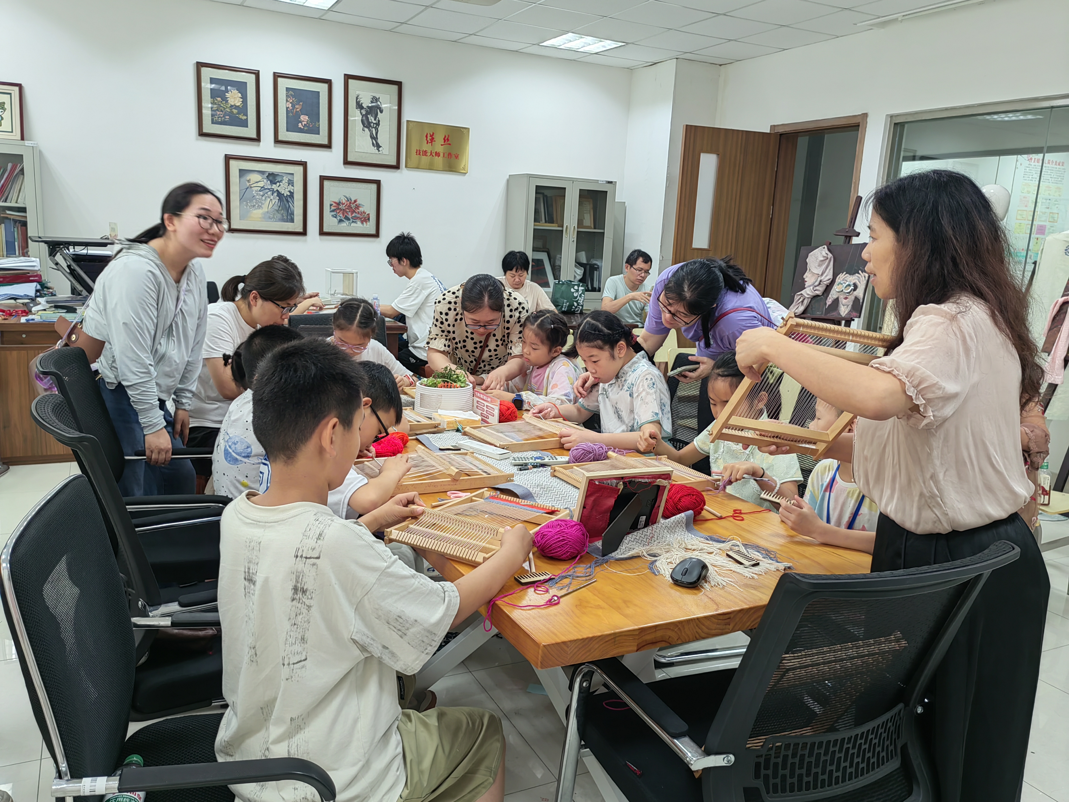 “雀踏花枝出素纨,曾闻人说缂丝难。要知应是宣和物,莫作寻常黹绣看……”7月2日上午,苏州经贸职业技术学院丝绸技艺中小学劳动教育实践基地缂丝织造技艺课程负责人黄紫娟老师正在给20个来自不同学校的中小学生们开展劳动教育课程。苏州缂丝织造技艺是首批国家级非物质文化遗产之一,有着十分悠久的历史和丰富的文化底蕴、素有“一寸缂丝一寸金”的美誉。黄紫娟老师首先介绍苏州缂丝的历史发展,让同学们感受缂丝悠久的历史;其次在缂丝织机前演示缂丝工艺流程,让同学们感受缂丝技艺之精;第三通过赏析缂丝产品,让同学们感受缂丝之美,最后通过在缂丝小织机上进行产品技艺技法操作来领悟缂丝艺人的匠艺之心。