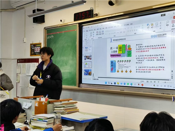 宣讲过程中,实践队伍采取了多种形式的宣讲方式。除了常规的进班宣讲外,还创新性地利用校园广播进行生动介绍,极大地扩大了活动的影响力和参与度。团队成员结合自身招生就业处学生助理的身份,发挥创意,将艺术与武设元素巧妙融合,展现了学校的独特魅力。在答疑环节,团队成员耐心解答学生们的问题,并给予积极问答的学生小礼品作为奖励,进一步激发了学生们的热情。