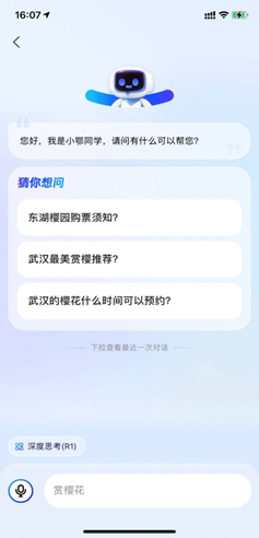 此外,支付宝为今年樱花节赋予科技活力,为游客定制了AI智能助手“小鄂同学”,游客与“小鄂同学”互动时输入“赏樱花”,即可答疑解惑,提供赏樱攻略,为赏樱旅途增添科技感。