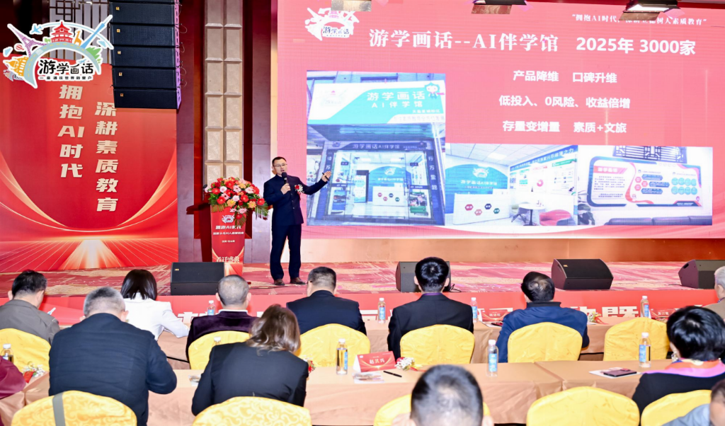 随后游学画话总经理严泓道先生就企业全面拥抱Deepseek,推出AI伴学系统、AI伴学馆、AI伴学小游玩偶系列、AI智慧体客服系统、AI教学教务系统等做了全面的介绍,当提到AI教学教务系统可以为教陪机构降低成本带动海量流量并产生巨大衍生收益、而且介入门槛极低、交付成本无压力无风险后,在座所有嘉宾响起热烈掌声并纷纷表示希望尽快合作。