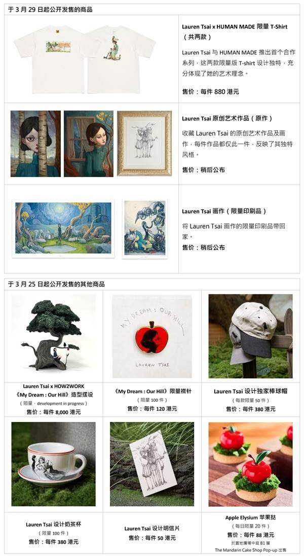 为让访客更深入体验《My Dream : Our Hill》的世界,置地廣塲更特别开设期间限定店,提供多款独家限量商品。其中最受瞩目的,是 Lauren Tsai 与日系美式潮流品牌 HUMAN MADE 的首次跨界合作,推出两款限量版T-shirt,充分展现其艺术风格。此外,现场更会展售Lauren Tsai的原创艺术作品及其画作、独家襟针、与HOW2WORK携手打造的限量版摆设,以及一系列由她亲自设计的时尚生活精品,访客可以透过这些收藏品记录这段艺术之旅。Lauren Tsai更将于3月27日(星期四)下午1时30分在期间限定店举办快闪见面,在指定时间内为顾客签名及进行互动!