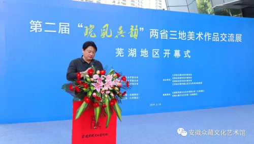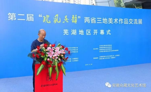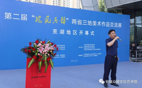 2019年5月24日下午3点,由江苏省无锡市文学艺术界联合会、安徽省芜湖市文学艺术界联合会、安徽省池州市文学艺术界联合会联合主办,江苏省无锡市美术家协会、安徽省芜湖市美术家协会、安徽省池州市美术家协会、无锡市惠山区文化体育和旅游局联合承办,安徽众藏文化艺术馆、无锡市惠山区文化馆协办的《第二届“皖风吴韵”两省三地美术作品交流展》芜湖地区展在安徽众藏文化艺术馆隆重开幕,开幕式由芜湖市美协主席王彪主持。