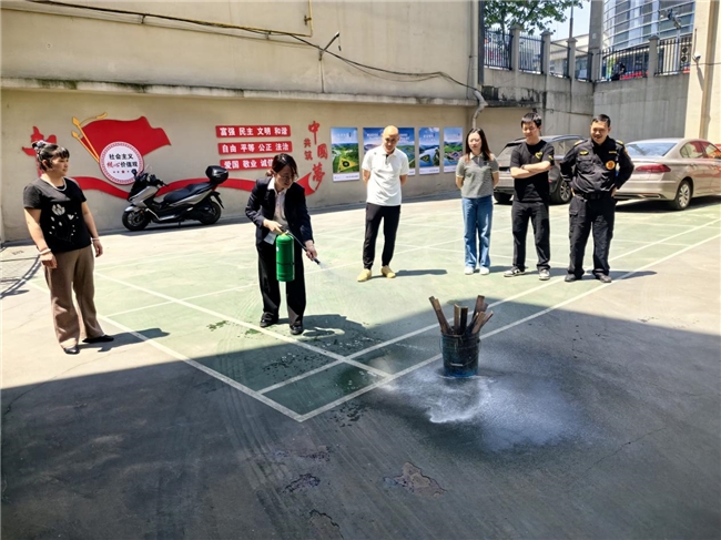 灭火实操:人人过关掌握“保命器”。在户外演练场,老师示范标准操作流程:“提瓶体、把插销、握喷管、压手柄,对准火焰根部扫射。”全体员工排队进行实操,让其掌握基础消防技能。