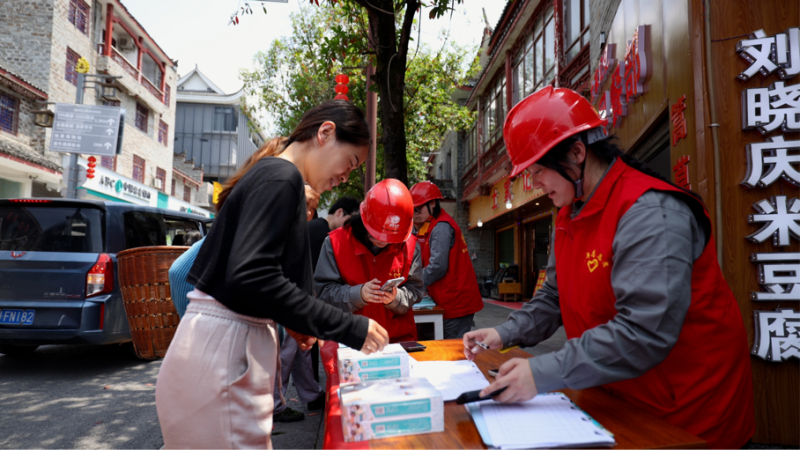 由8名青年志愿者组成的电力宣讲组在芙蓉镇景区入口处开设宣传点,向往来用户发放景区用电安全指南、办电业务知识手册等宣传册,讲解日常生活用电注意事项,呼吁用户响应错峰用电,加入到科学用电、节约用电的队伍中来,并通过情景模拟演示的方式携手营造良好供用电氛围。