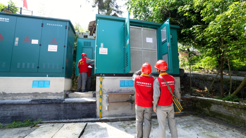 在芙蓉镇核心景区内,设备巡视组的两名志愿者正对观音阁2号箱变进行测温,两人配合默契,一人手持红外测温仪观测设备温度,另一人同步对温度数据做好记录,便于在后续工作中进行比对。