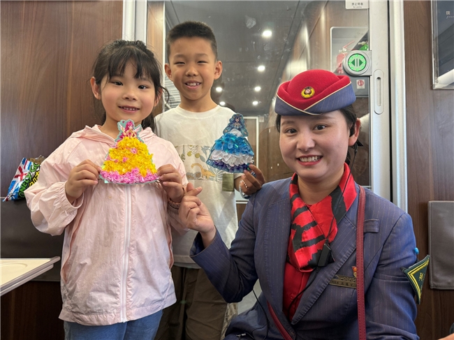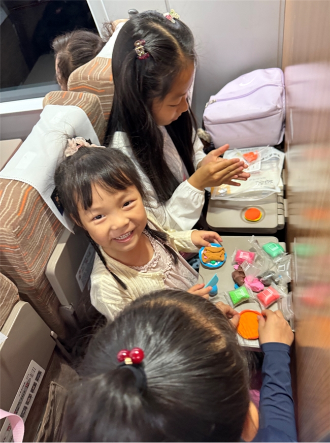 列车长孟露,以细腻的心思和满腔的热情,提前为这趟旅行添上了别样的色彩。她精心准备了五彩斑斓的彩泥和各式各样的手工小玩具,旨在让每一位踏上列车的小朋友都能在旅途中找到属于自己的小天地,享受创造的乐趣。这份特别的安排,不仅让小朋友们的小手忙碌起来,心灵得到了极大的满足,更让陪同的父母得以片刻的轻松,享受旅途的宁静。