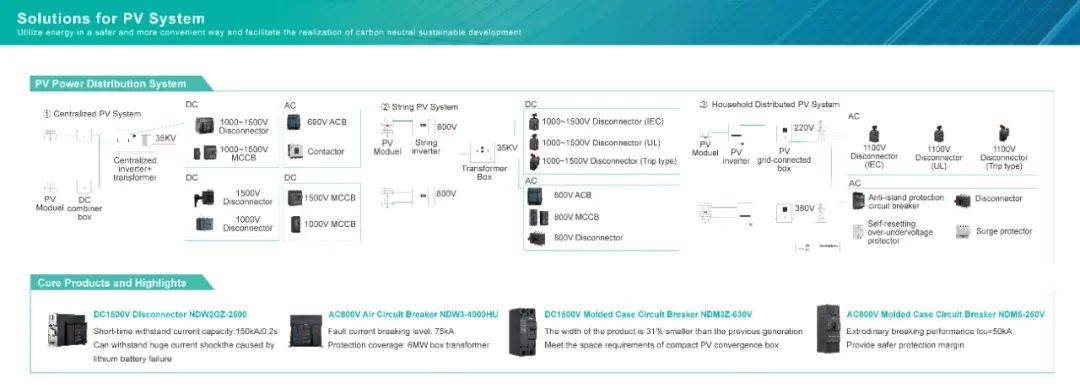 户用分布式光伏系统针对常见电压,交流侧还增设防孤岛保护断路器等保障安全。核心产品更是亮点十足。DC1500V隔离开关NDW2GZ-2500具备150kA/0.2s短时耐受电流能力,可抵御锂电池故障大电流冲击;AC800V空气断路器NDW3-4000HU故障电流分断能力达75kA,能保护6MW箱式变压器;DC1500V塑壳断路器NDM3Z-630V宽度缩31%,适配紧凑型光伏汇流箱;AC800V塑壳断路器NDM5-250V分断性能卓越,Icu=50kA,安全裕度更高。