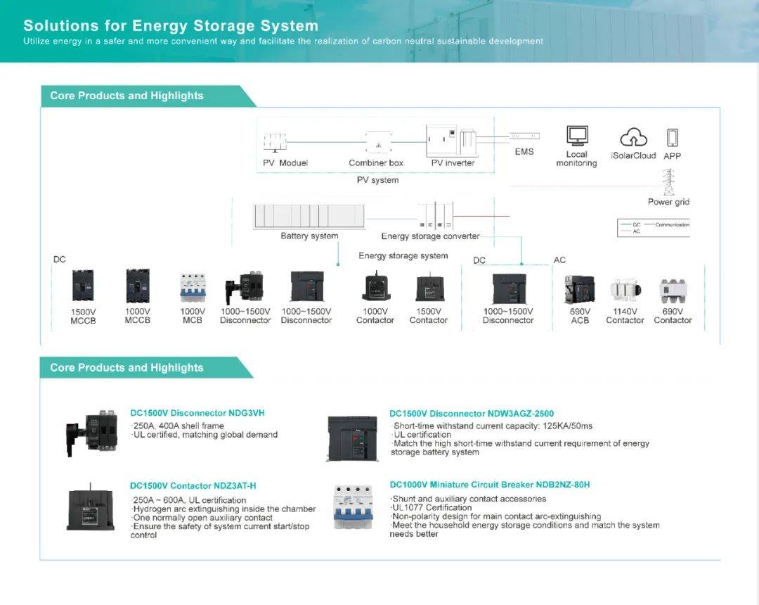 其核心产品各有优势。DC1500V隔离开关NDG3VH有315A、630A壳架等级且获UL认证;DC1500V隔离开关NDW3AGZ-2500短时耐受电流125kA/50ms,满足储能电池高要求;DC1500V接触器NDZ3AT-H可达到DC1500V 600A,且通过UL认证,保障系统电流启停安全;DC1000V微型断路器NDB2NZ–80V带附件,无极性设计适配户用储能。