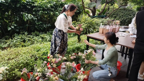 桂语映月·鲜花DIY工坊:妈妈与孩子化身“花艺师”,挑选康乃馨、满天星等花材,共同设计专属花礼。一位爸爸偷偷记录下妻女专注插花的背影:“平时都是妈妈为孩子忙碌,今天她们合作的样子特别美好。”