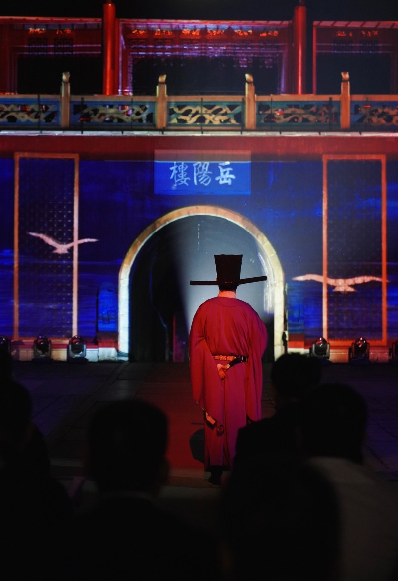 随着天色渐暗,岳阳楼渐渐“入戏”。《今上岳阳楼》从“读者剧场”的一本本书籍开始,媒体记者被“删去”观众身份,转而成为“行者”,随着灯光、音效与剧情的引导,沿着岳阳楼历史文化的脉络穿梭。