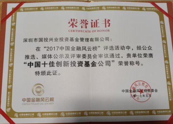 深圳市国投兴业投资基金管理有限公司:在“2017中国金融风云榜”评选活动中,经公众推选、媒体公示及评审委员会审议通过,贵单位荣膺“中国十佳创新投资基金公司”荣誉称号。
