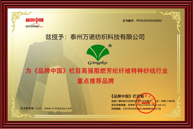 对创新的执着追求以及对技术的坚定投入,为万诺纺织赢得了广阔的市场和发展前景。凭借强大自主研发能力,万诺纺织一路开拓、持续创新,始终坚持在高技术壁垒和市场快速变化中进行自我超越,坚定与客户和行业共同成长,业务覆盖面和行业影响力持续扩大。2023年和2024年在高强阻燃芳纶纤维特种纱线细分领域全国市场占有率分别达11.14%和11.35%,2025年,更是凭借其在相关细分领域的深度应用和广泛创新实践,荣膺“《品牌中国》栏目重点推荐品牌”授牌。