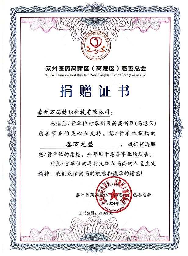 在追求高质量发展的同时,万诺纺织始终践行社会责任担当。面对新冠肺炎疫情,公司第一时间向相关部门捐款1万元,为抗疫一线提供支持;2023年,积极参与许庄街道“金秋助学 圆梦行动”活动,助力寒门学子逐梦求学路;2024年,公司向泰州医药高新区慈善总会捐赠3万元,以实际行动回馈社会。从疫情防控到教育帮扶,万诺纺织用一次次善举,彰显科技企业的责任与温度。
