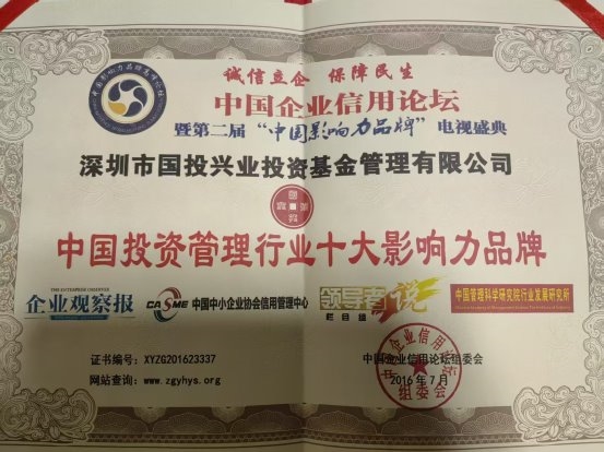 2016年,中国企业信用论坛暨第二届“中国影响力品牌”电视盛典活动期间,经公众推选、媒体公示及评审委员会审议通过,深圳市国投兴业投资基金管理有限公司荣膺“中国投资管理行业十大影响力品牌”荣誉称号。证书编号:XYZG201623337。认证单位有:《企业观察报》、中国中小企业协会信用管理中心、领导者说栏目组、中国管理科学研究院行业发展研究所。